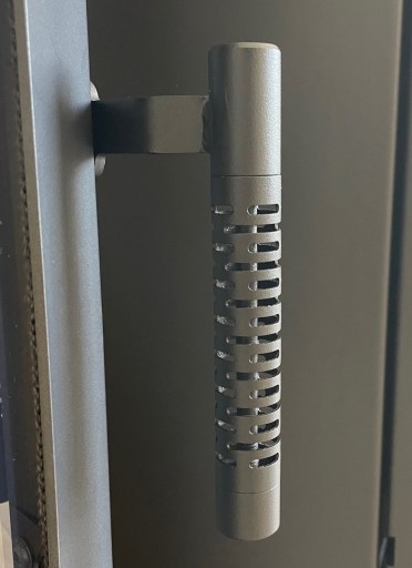 Drzwi wkładu posiadają nowoczesną klamkę. Jej specjalna perforowana konstrukcja powoduje naturalne schładzanie. Wygodna rękojeść gwarantuje wygodne otwieranie kominka.