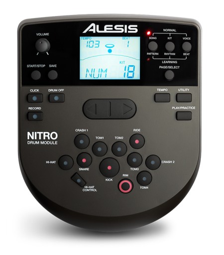 Moduł Alesis Nitro jest bogaty w niezliczone ilości brzmień, podkładów i trybów. Cała kontrola odbywa się na poziomie modułu, za pomocą intuicyjnych przycisków i dużego wyświetlacza LCD. Przyciski skonstruowane zostały na wzór zestawu akustycznego, aby ułatwić szybką pracę i przypisywanie własnych brzmień w trybie użytkownika. Fabrycznie moduł zawiera 40 gotowych i znakomicie dopasowanych brzmień perkusji od stylu elektro po metal i jazz. Łacznie mieści aż 385 barw i pojedynczych dźwięków, a dla spragnionych gry z innymi, kolejne 60 podkładów muzycznych o różnych stylistykach.