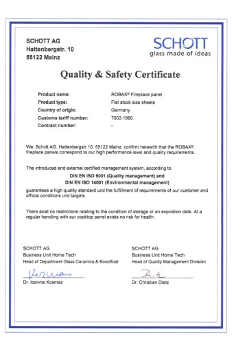 Wyjątkowe szkło kominkowe samoczyszczące IR MAX znanej i cieszącej się zaufaniem użytkowników marki Schott Robax ®.