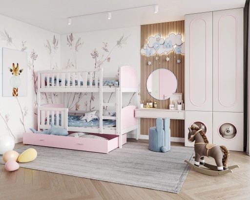 - Pojemna szuflada wysuwana na kółkach. Może służyć jako pojemnik na pościel lub zabawki (szuflada jest oddzielnym elementem łóżka).