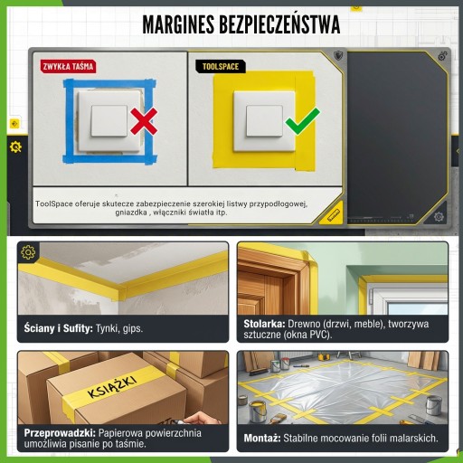 Jako zespół ToolSpace wiemy, że na rynku jest mnóstwo tanich taśm, które rwą się w rękach i zostawiają klej, zmuszając Cię do godzinnego skrobania futryn. Naszym celem było dostarczenie produktu, który jest "złotym środkiem".