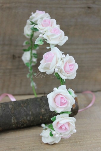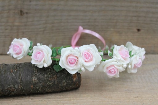Śliczny i niezwykle romantyczny wianek komunijny w stylu boho, zdobiony różyczkami w kolorze biało różowym, zielonymi listkami bluszczu których kształt przypomina serduszka, kremowymi koralikami oraz tasiemką dopasowaną do koloru róż.