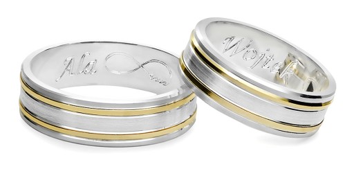 Oferowanym przedmiotem są ręcznie robione obrączki srebrno złote. Materiały z których obrączki są wykonywane to srebro w próbie 925 oraz złoto w próbie 585. Obrączki znakowane są zgodnie z Polskim prawem probierczym. Grawerowanie wewnątrz obrączki oraz etui są gratis.