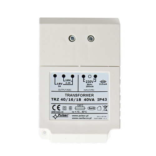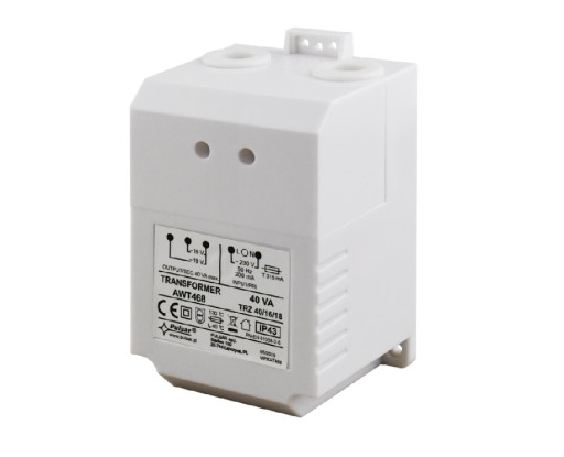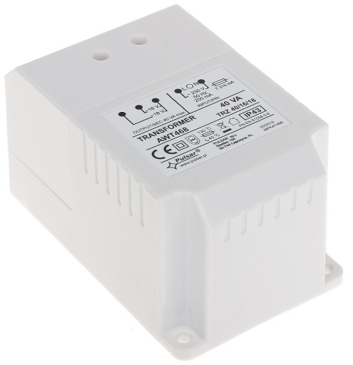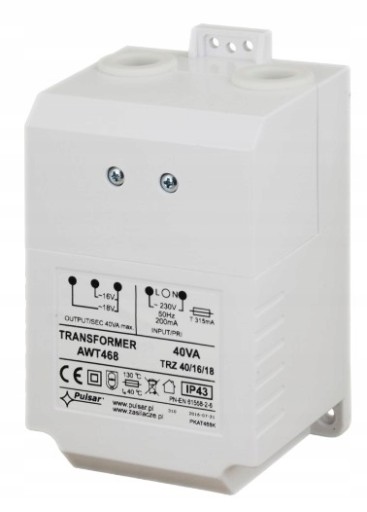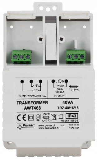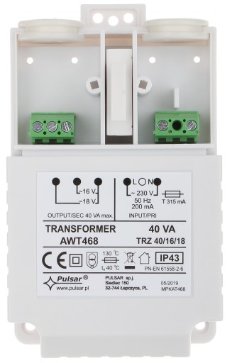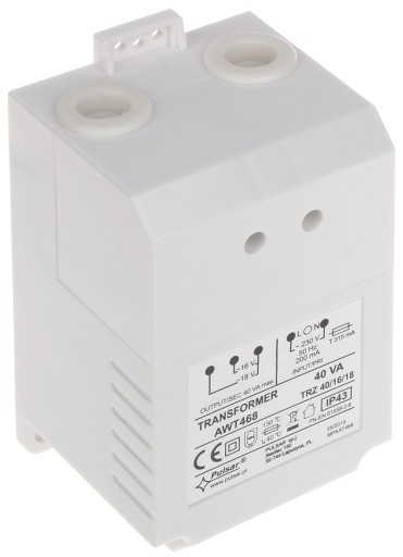 Transformator Pulsar AWT468 (TR 40VA) dedykowany jest do zasilania urządzeń wymagających napięcia AC: U1, U2 lub U3. Moc odbiorników dołączonych do zacisków transformatora nie może przekroczyć jego mocy znamionowej. W celu zachowania wymaganej klasy szczelności (IP43) transformator należy montować w pozycji pionowej.