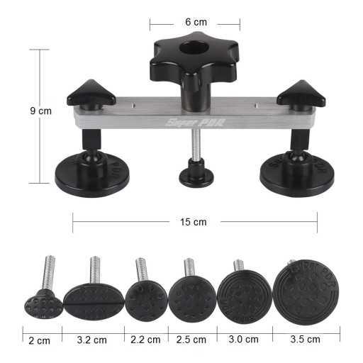 Mostek wraz z 6 gwintowanymi adapterami charakteryzuje się wyjątkowo dużą siłą ciągnięcia. Bez problemu poradzi sobie z małymi i średnimi uszkodzeniami. Regulowany rozstaw nóżek pozwoli na dostosowanie się do wgniecenia od niewielkiego aż do 15 cm.
