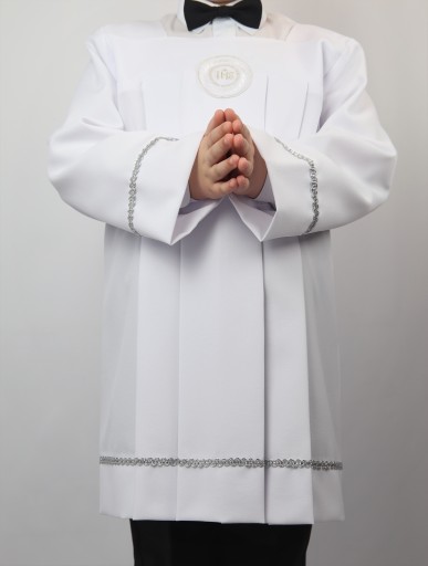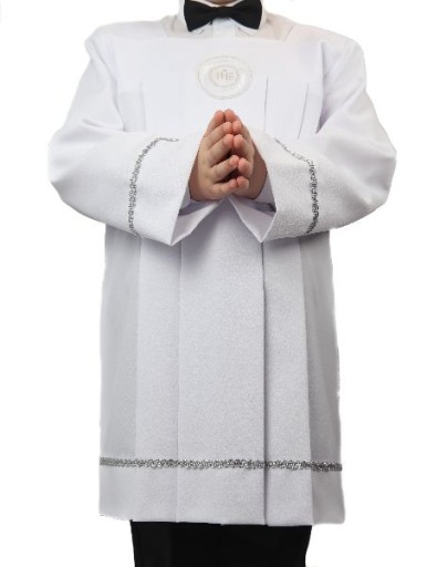 - Komża obszyta na rękawach i dole komży srebrną taśmą