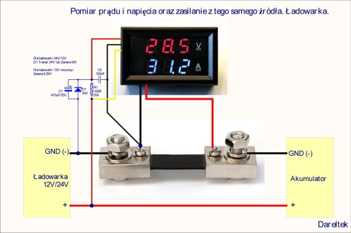 Zakres napięcia pomiarowego - 0V do 99,9V. Czarny - , żółty + (małe gniazdko zasilające).