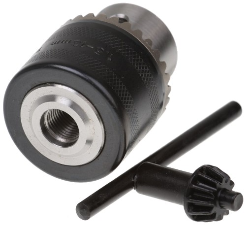 - Uchwyt wiertarski (głowica do wiertarki) na kluczyk , wykonany z wysokogatunkowej stali, posiada rozstaw szczęk od 1,5 mm do 13 mm.