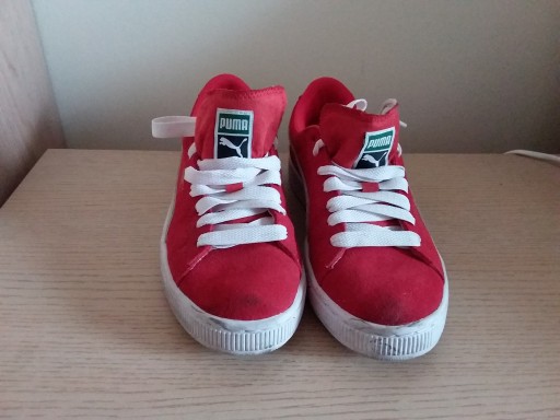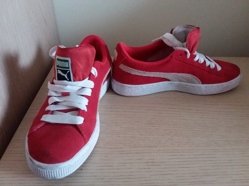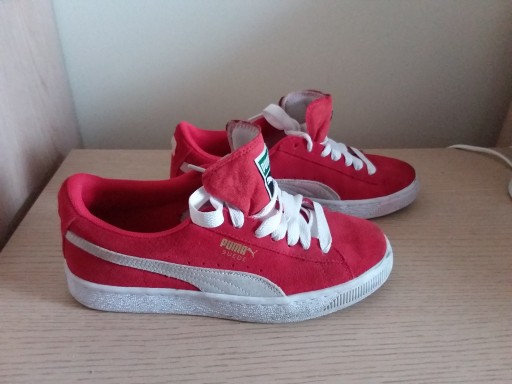 Klasyczne,damskie trampki marki Puma. Buty sportowe wykonane z naturalnego zamszu w kolorze czerwonym nałożone kilka razy, stan widoczny na zdjęciach