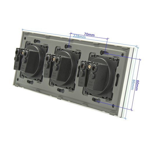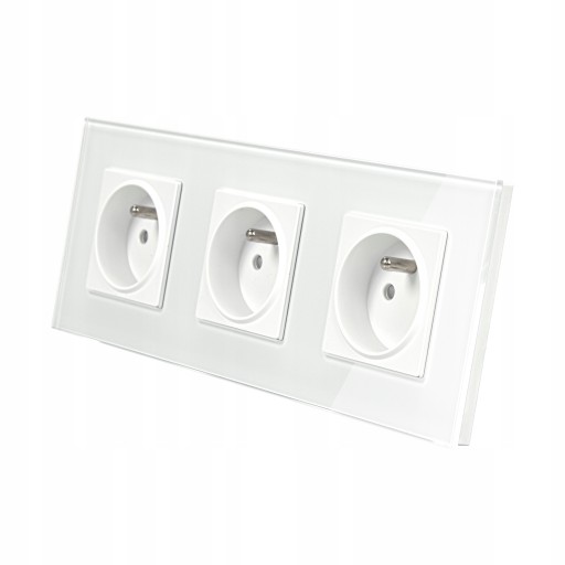 Potrójna ramka szklana biała w zestawie z trzema gniazdami elektrycznymi z bolcem, komplet gotowy do montażu.