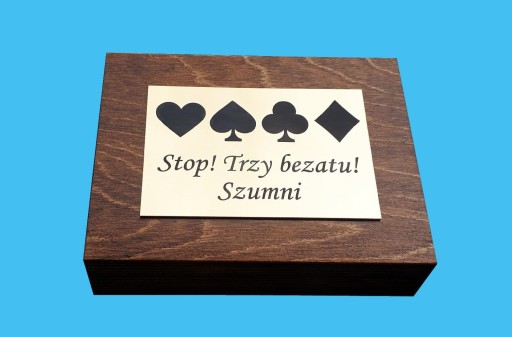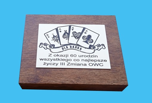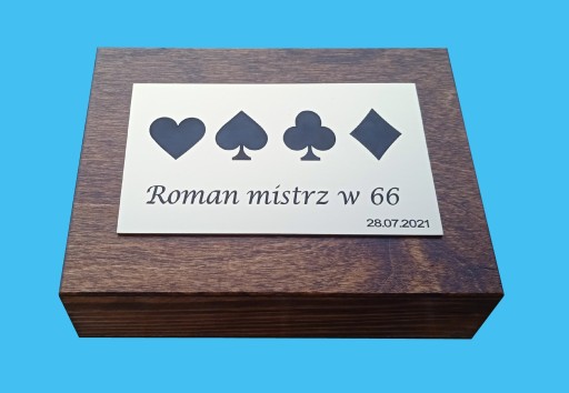 Pudełko drewniane olejowane na kolor orzech oraz pomalowane lakierem bezbarwnym o wysokim połysku. Wymiary pudełka 155 mm x 123 mm x 40 mm. W cenę wliczona jest usługa grawerska (grawer loga lub nazwa). Grawer wykonuję w blaszce z mosiądzu grawerskiego techniką graweru laserowego (laser FIBER) czarne litery/grafika na złotym tle. Grawer wykonuję na podstawie zdjęć, skanów lub odręcznego szkicu. Graweruję dowolny tekst lub dedykacją.