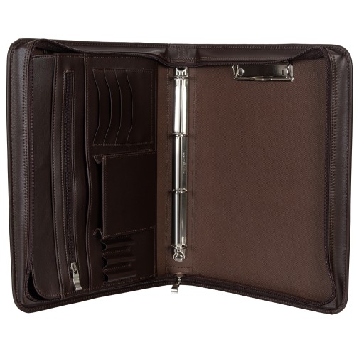 Wewnątrz biwuara znajdują się 2 przegrody, , kieszonka na zamek, miejsce na wizytówki oraz długopisy. Posiada klips na dokumenty A4 oraz mechanizm ringowy na koszulki. Zamykana na dobrej jakości zamek błyskawiczny.