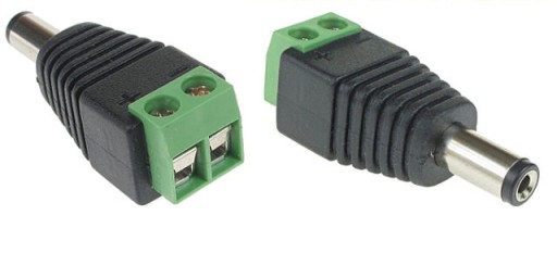 Wysokiej przejściówka służąca np. do podpięcia zasilania do kamery zakończona z jednej strony wtykiem DC 2.1/5.5 na kostkę połączeniową 2 torową.