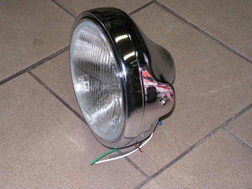 nowa lampa chromowana metalowa przeznaczona do przodu kompletna z przewodami do podłączenia z żarówkami 12V H-4 60/55 W oraz postojem 5 W LAMPA posiada homologację mocowanie boczne przeznaczona głównie do SUZUKI GSX BANDIT HONDA CB LTD oraz wieli innych motocykli