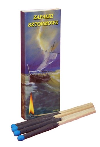 Zapałki sztormowe odporne na wiatr oraz wilgoć. Palą się bardzo intensywnym płomieniem przez kilka sekund a do ich zgaszenia potrzebna jest woda.