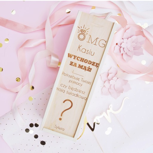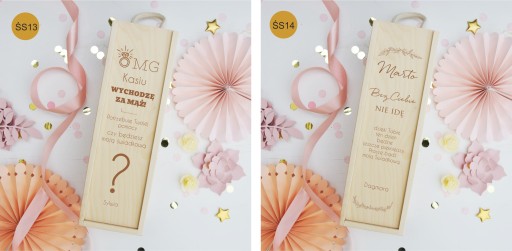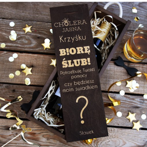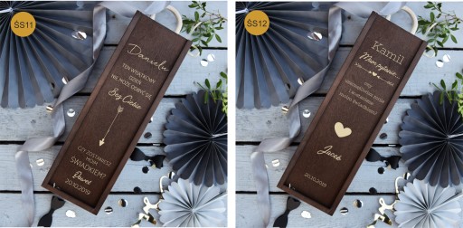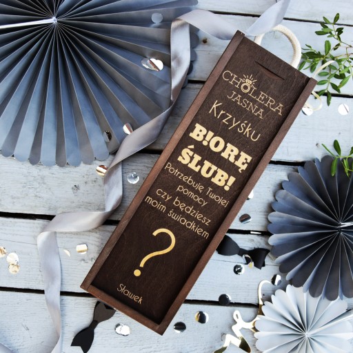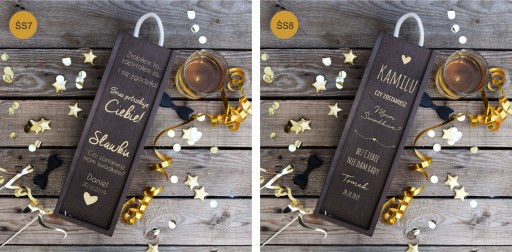 - drewnianą skrzynkę na 1 alkohol w formie SKRZYNKI ZE SZNURKIEM w kolorze brązowym lub naturalnym
