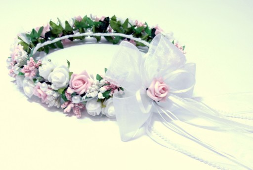 Tył wianka ozdabia biała , szyfonowa kokarda , atłasowe tasiemki, perełki nanizane na sznureczek i komponująca się z całym wiankiem różowa różyczka.