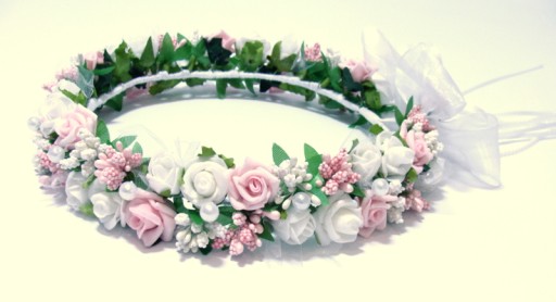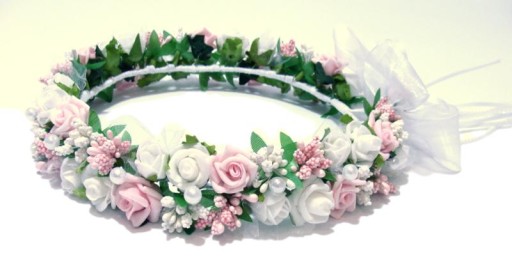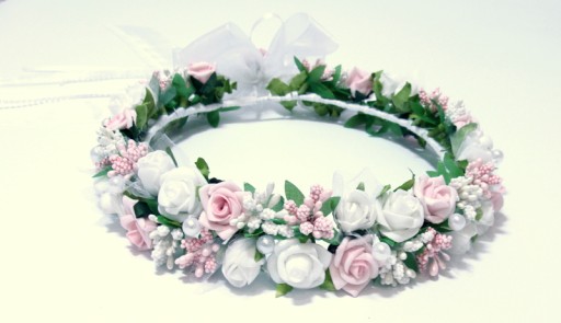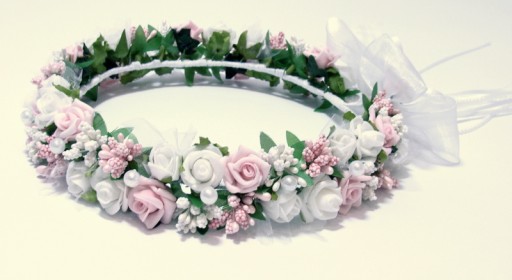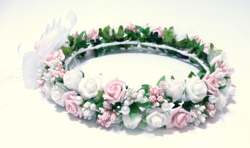 Wianek spleciony z białych i różowych różyczek piankowych, ozdobiony białymi szyszeczkami. Dodatkowo zdobiony perełkami.