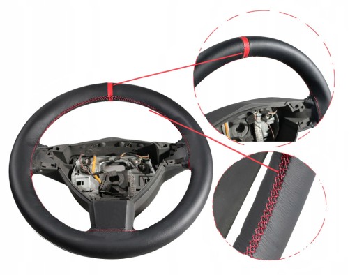 Nałożyć pokrowiec na kierownice w taki sposób aby łączenie skóry, znalazło się na górze kierownicy i na środku kierownicy.