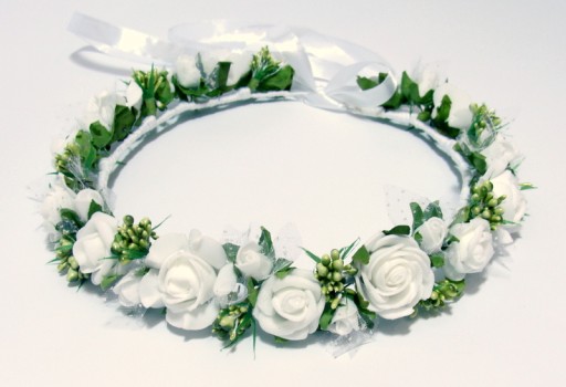 Wianek spleciony z różyczek piankowych, w tonacji bieli i zieleni.