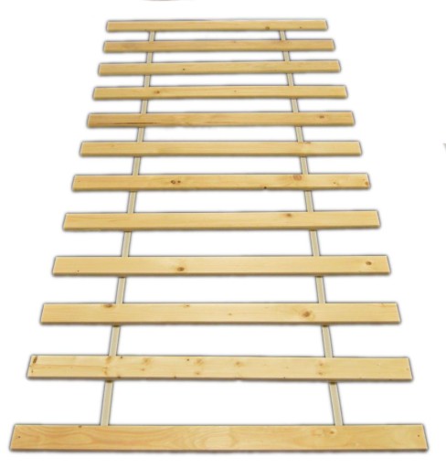 Stelaż z drewna świerkowego pod materac 140x200 składa się z 12 listew połączonych tasiemką, dzięki temu podczas montażu stelaża listwy zachowują odpowiednią odległość. Zaokrąglone listwy po szerokości sprawiają iż stelaż nie wcina się w pokrowiec materaca. Należy pamiętać iż łóżko powinno posiadać listwę środkową i tzw. piątą czy szóstą nogą w przeciwnym razie pod wpływem zbyt dużego ciężaru stelaż może ulec wygięciu lub złamaniu.