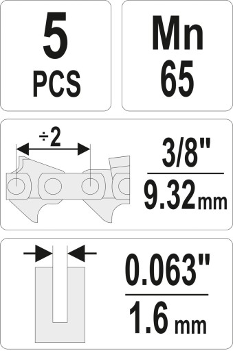 Zestaw składa się z 5 kompletnych ogniw przeznaczonych do zakuwania łańcuchów tnących do pilarek do drewna o podziałce 3/8" (9,32mm) oraz szerokości 0,063" (1,6mm).