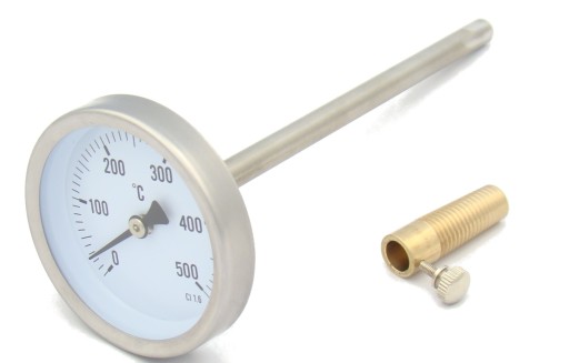 Przedmiotem oferty jest popularny termometr tarczowy z sondą o długości 150mm. Sonda wykonana ze stali nierdzewnej. Zakres pomiaru od 0 do +500 stopni C. Termometr często używany w wędzarniach, piecach itp. Przesuwany króciec pozwala swobodnie regulować wysunięcie sondy.