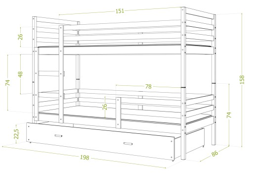 - Pojemna szuflada wysuwana na kółkach. Może służyć jako pojemnik na pościel lub zabawki (szuflada jest oddzielnym elementem łóżka).