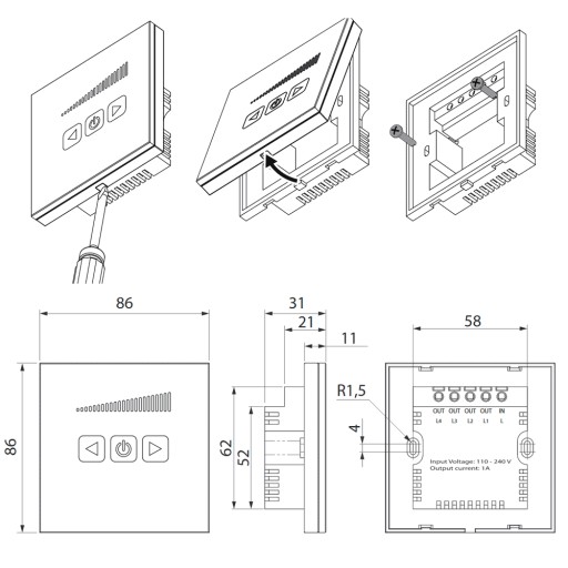 Regulator należy zainstalować na ścianie, wewnątrz pomieszczenia w puszce podtynkowej, za pomocą uchwytów rozporowych. Może być montowany w standardowych puszkach montażowych.