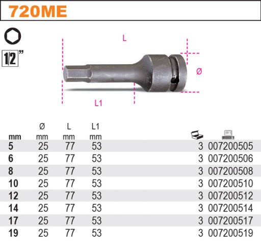 NASADKA UDAROWA Z KOŃCÓWKĄ TRZPIENIOWĄ SZEŚCIOKĄTNĄ, Z GNIAZDEM 1/2", MODEL 720ME