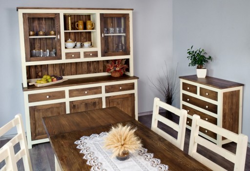 - Kredens drewniany rustykalny wykonany został z wysokogatunkowego litego drewna sosnowego. Następnie jego powierzchnię pokryto naturalnym woskiem pszczelim.