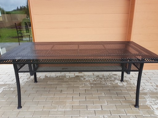 Stół posiada blat z blachy perforowanej o wymiarach 90x190 cm.