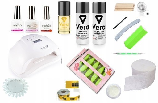 Zestaw startowy do manicure hybrydowego z lakierem Indigo, wydajną lampą LED 54W + wszystkie niezbędne preparaty i akcesoria.