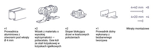 - Wózki wyposażono w łożyska igiełkowe o podwyższonej wytrzymałości, które zapewniają bezawaryjną pracę do 100000 cykli otwierania i zamykania drzwi o wadze do 60 kg