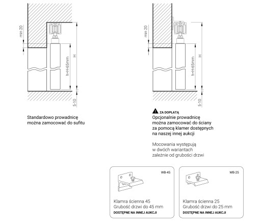 - Dostępne produkty uzupełniające: klamry mocujące prowadnicę do ściany, domykacz, uchwyty maskownicy drewnianej, maskownica aluminiowa z zaślepkami bocznymi (w przypadku mocowania do ściany), maskownica aluminiowa płaska (montaż maskownicy płaskiej możliwy również w przypadku prowadnicy mocowanej do sufitu, należy wtedy zastosować tulejki dystansowe)