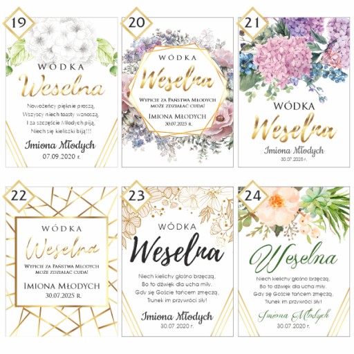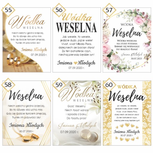 Naklejki na wódkę pasujące na większość butelek o pojemności 0,5 l (np. Sobieski) z imionami i datą ślubu Młodej Pary. Naklejki drukowane cyfrowo, co gwarantuje doskonałą jakość wydruku oraz odporność na chłodzenie w lodówce, innymi słowy naklejka nie rozpływa / odkleja się po wyjęciu z lodówki i podaniu na stół. Butelki z naklejkami należy przechowywać w lodówce nie w zamrażarce. Wymiar naklejki : 75 x 105 mm. W każdym wzorze jest możliwość dodania indywidualnego wierszyka, zmiany czcionki, zmiany koloru czcionki, zmiany napisu Wódka Weselna np. na Starostówka ... . Jeśli posiadają Państwo Własny projekt chętnie go dla Państwa wydrukujemy nie wpływa to na dodatkowe koszty. Możemy przygotować indywidualny projekt który jest GRATISOWY. Przy zamówieniu 1 kompletu naklejek mają Państwo do wyboru jeden wzór, przy 2 kompletach 2 wzory... itp. W razie jakichkolwiek pytań, proszę pisać.