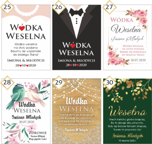 Np.: ( Ania i Marcin, 20 Sierpnia 2020 r. , wzór 1,4,30 ..., uwaga zmiana wierszyka w etykiecie numer 4 na ten z etykiety numer 14 )