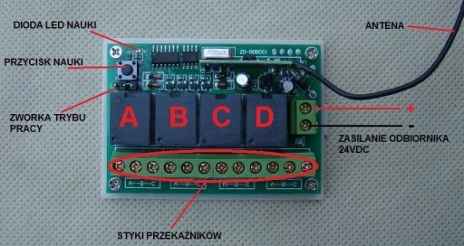 Odbiornik wielkosci 7,5x5,5cm i grubosci 2,5cm. Zasilanie przez 24VDC (+- 2V) wg schematu. Kazdy kanał posiada przekaźnik z wyprowadzonymi 3 pinami :wspólny COM (oznaczony jako B) , NO (A) oraz NC (C).