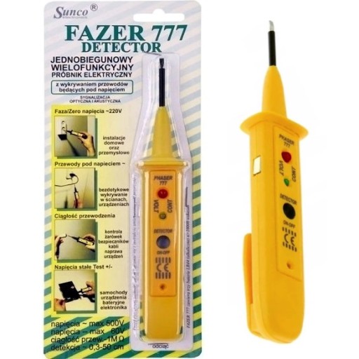 Fazer 777 detector przeznaczony jest do wykonywania podstawowych testów instalacji elektrycznych 220V/380V, instalacji samochodowych i innych instalacji elektrycznych. Fazerem 777 sprawdzić można również poprawność pracy urządzeń elektrycznych. W elektronice Fazer 777 pozwala pozwala między innymi wykryć 0/1 oraz pozwala sprawdzić, czy rezystor, kondensator, dioda i transformator nie są uszkodzone. Nie zastąpioną funkcją Fazera 777 jest wykrywanie napięcia "~" bez potrzeby dotykania obiektu. Fazer pozwala na wykrycie przewodów biegnących w ścianach na głębokości do 10cm jak również wykryć "Fazę" wszędzietam gdzie niemożliwy jest bezpośredni kontakt. Łatwe jest również wykrycie pęknięcia przewodu w izolacji. Regulacja czułości detekcji pozwala na wykrycie napięcia z odległości 0,3cm do 50cm w zależności od warunków zewnętrznych. Przyrząd nie posiada wyłącznika zasilania - fazer pobiera prąd tylko w momencie pomiaru. Fazer 777 jest nierozbieralny - pozwala na przeprowadzenie ponad 10 000 wskazań.