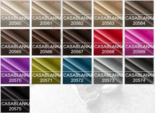 Casablanca - tkanina miękka i przyjemna w dotyku. Materiał ten przypomina plusz o delikatnie mieniącej się powłoce. Jest wytrzymała oraz posiada właściwości hydrofobowe i trudnopalne. Materiał posiada wysoką odporność na zadrapania i sierść zwierząt domowych. Certyfikat PETPROOF potwierdza, że sierść nie wbija się między nitki wątku i osnowy, przez co można łatwo usunąć z powierzchni materiału za pomocą ściereczki lub rolki do ubrań.