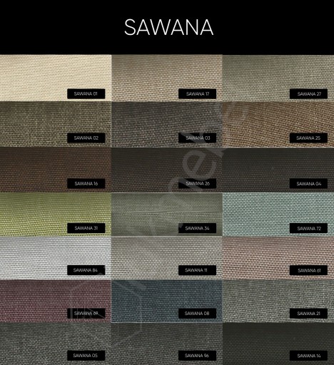 Sawana - jest tkaniną łatwą w utrzymaniu czystości o delikatnej i miłej w dotyku strukturze w formie plecionki. Została stworzona z włókien syntetycznych, które zapewniają odporność na działanie światła. Posiada wzmocnienie wykonane z dodatkowej siateczki, która zwiększa jej wytrzymałość na rozdzieranie.
