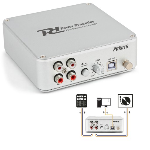 Dzięki przedwzmacniaczowi Phono Power Dynamics PDX015 możesz łatwo podłączyć swój gramofon do komputera. PDX015 zapewnia, że sygnał z elementu MM jest wzmocniony i zdigitalizowany. Korzystając z dołączonego oprogramowania, możesz bez wysiłku nagrywać wszystkie winyle, aby zdigitalizować swoją kolekcję. PDX015 jest wyposażony w złącze USB, które zapewnia, że jest postrzegany jako zewnętrzna karta dźwiękowa. Przełącznik „Line/ Phono” umożliwia podłączenie innych źródeł dźwięku przez USB do komputera PC z opcją digitalizacji.