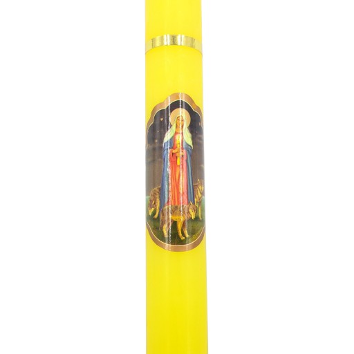 Świeca o średnicy 3 cm ozdobiona została złotymi elementami oraz wizerunkiem Matki Bożej Gromnicznej.