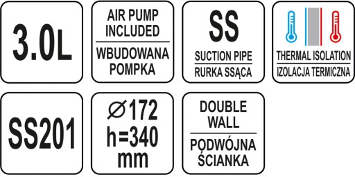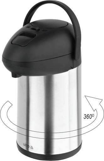 Termos stołowy z pompką marki YATO o pojemności 3,0L jest starannie wykonany z najwyższej jakości stali nierdzewnej. Satynowe wykończenie korpusu nadaje mu eleganckiego wyglądu, dzięki czemu doskonale prezentuje się w salach konferencyjnych, restauracjach czy hotelach. Podwójne ścianki, pomiędzy którymi jest strefa próżniowa, zapewniają doskonałe właściwości termoizolacyjne. Dzięki temu gorące napoje takie jak kawa czy herbata utrzymują wysoką temperaturę przez wiele godzin.Termos wyposażony jest w pompkę ułatwiającą precyzyjne nalewanie napojów. Natomiast rurka ssąca wykonana jest ze stali nierdzewnej, przez co możliwe jest utrzymanie jej w nienagannej czystości bez nadmiernego wysiłku. Termos YATO posiada także zabezpieczenie przed kapaniem, które zapobiega rozlewaniu się napojów. Wygodny plastikowy uchwyt ułatwia transport termosu.
