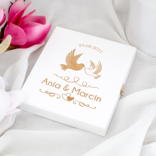 1 sztuka zaproszenia w formie drewnianego pudełka w kolorze białym z ozdobnym złotym zapięciem oraz z wklejkami drukowanymi na papierze ozdobnym. Papier posiada delikatną fakturę.