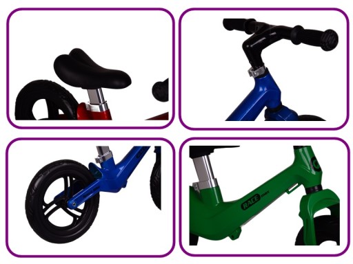 Rowerek charakteryzuje się opływowym kształtem ramy, nie posiada ostrych krawędzi i jest ultralekki. Ma nowoczesny kształt i piankowe koła. Został wykonany z innowacyjnego stopu magnezu, posiada możliwość regulacji wysokości siedziska i kierownicy. Rowerek jest przeznaczony dla dzieci o wzroście od 80 do 120 cm i maksymalnym obciążeniu 30 kg.