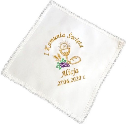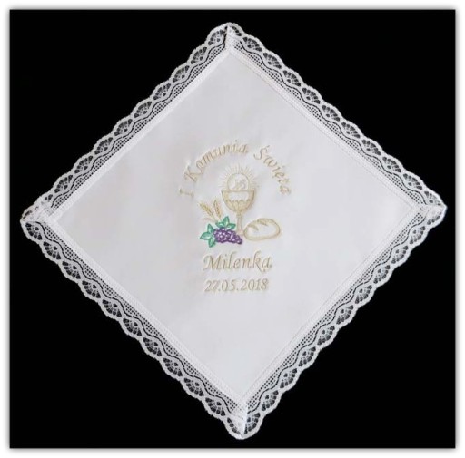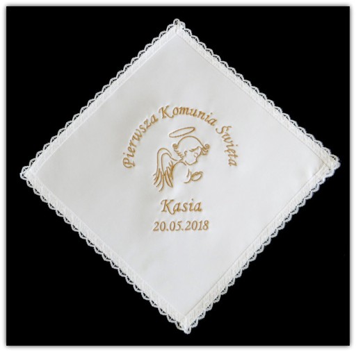 Wyjątkowa chusteczka z Twoim indywidualnym haftem (imieniem dziecka, datą I Komunii Świętej, grafiką)