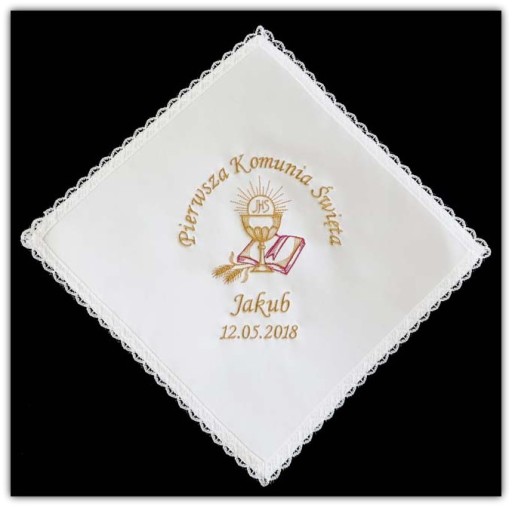 Wyjątkowa chusteczka z Twoim indywidualnym haftem (imieniem dziecka, datą I Komunii Świętej, grafiką)