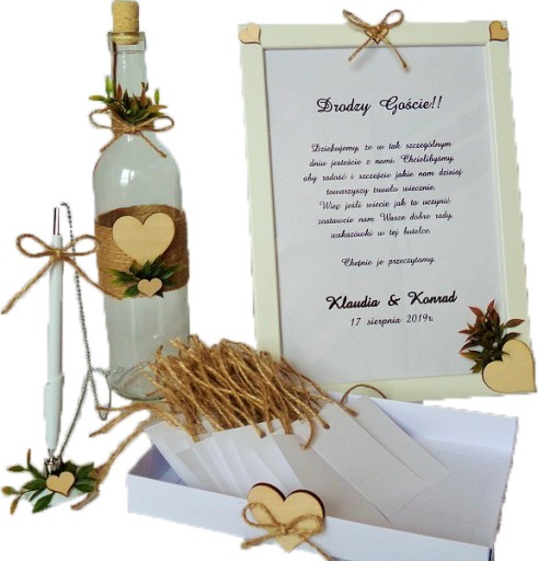 * butelka o wysokości ok. 30cm i pojemności 0,75l, do której goście mogą wrzucić karteczki z życzeniami,