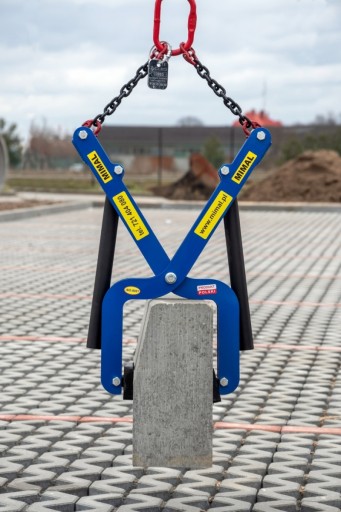 Służy do ręcznego i mechanicznego przemieszczania i ustawiania krawężników i innych elementów betonowych o wadze do 150 kg. Posiada duże szczęki z wkładkami gumowymi, które zapewniają skuteczny uchwyt elementów. Zamontowany łańcuch służy do podwieszania urządzenia pod koparkę lub inne podobne urządzenia. Powierzchnie malarskie wykonane metodą proszkową zapewniają mu trwałość oraz estetykę.